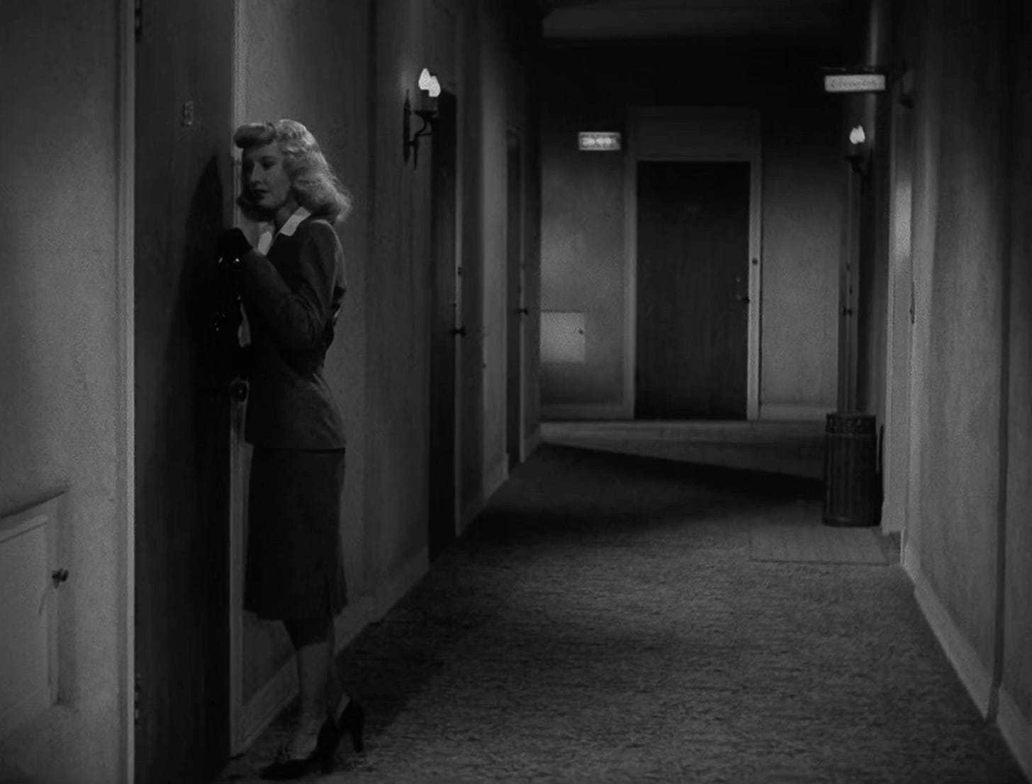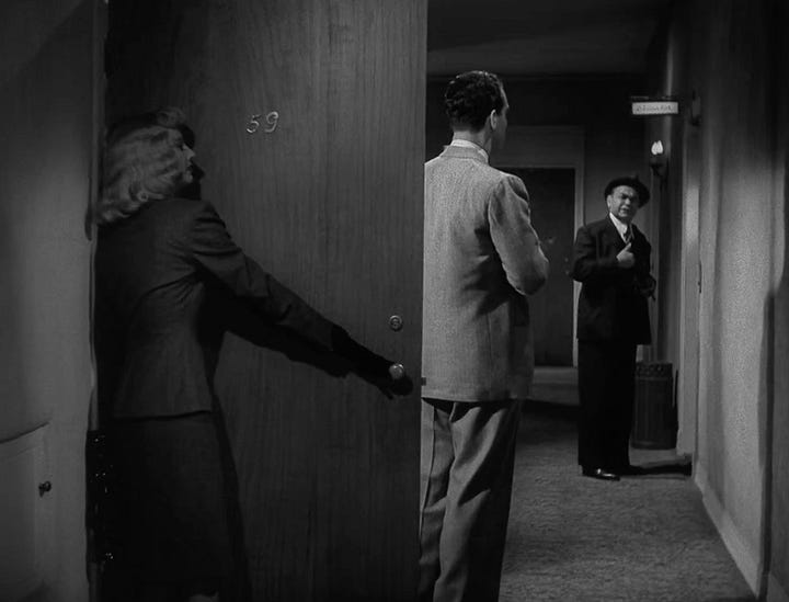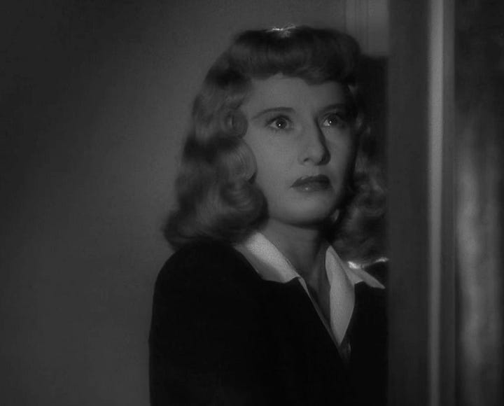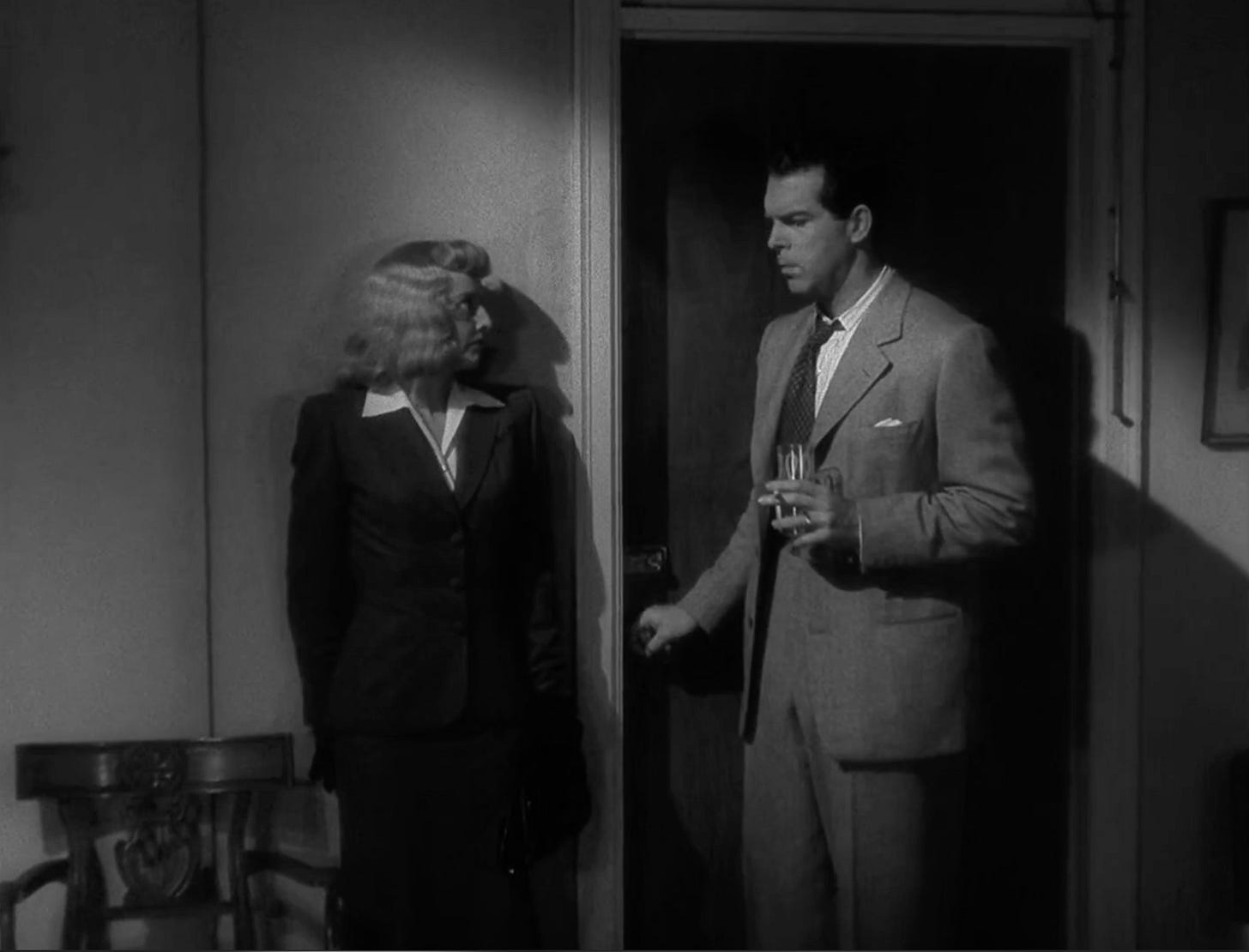 Eavesdropping — femme fatale Phyllis (Barbara Stanwyck) listens in on her boyfriend Walter (Fred MacMurray) talking to his boyfriend Barton (Edward G. Robinson)