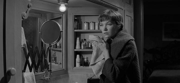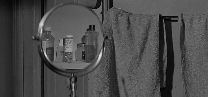 The camera moves closer as Fran comes in and washes her face, then as she dries her face with a towel — the motion which brings our attention more fully to her face — we see her eyes fixate on the mirror, before the scene cuta to an insert shot, showing what Fran is looking at.