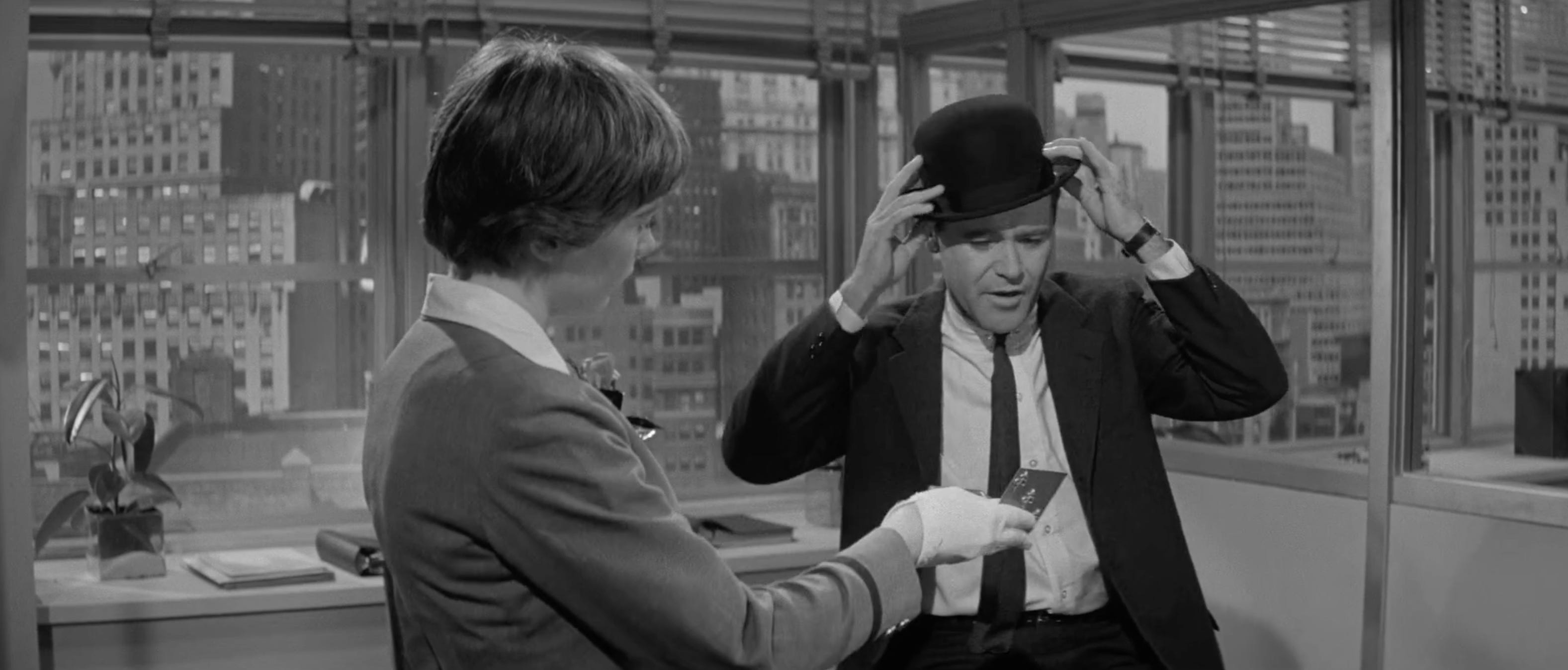 Five minutes of screentime (and a few days of ‘real’ time) later, Baxter tries on a hat for Fran (Shirley MacLaine)