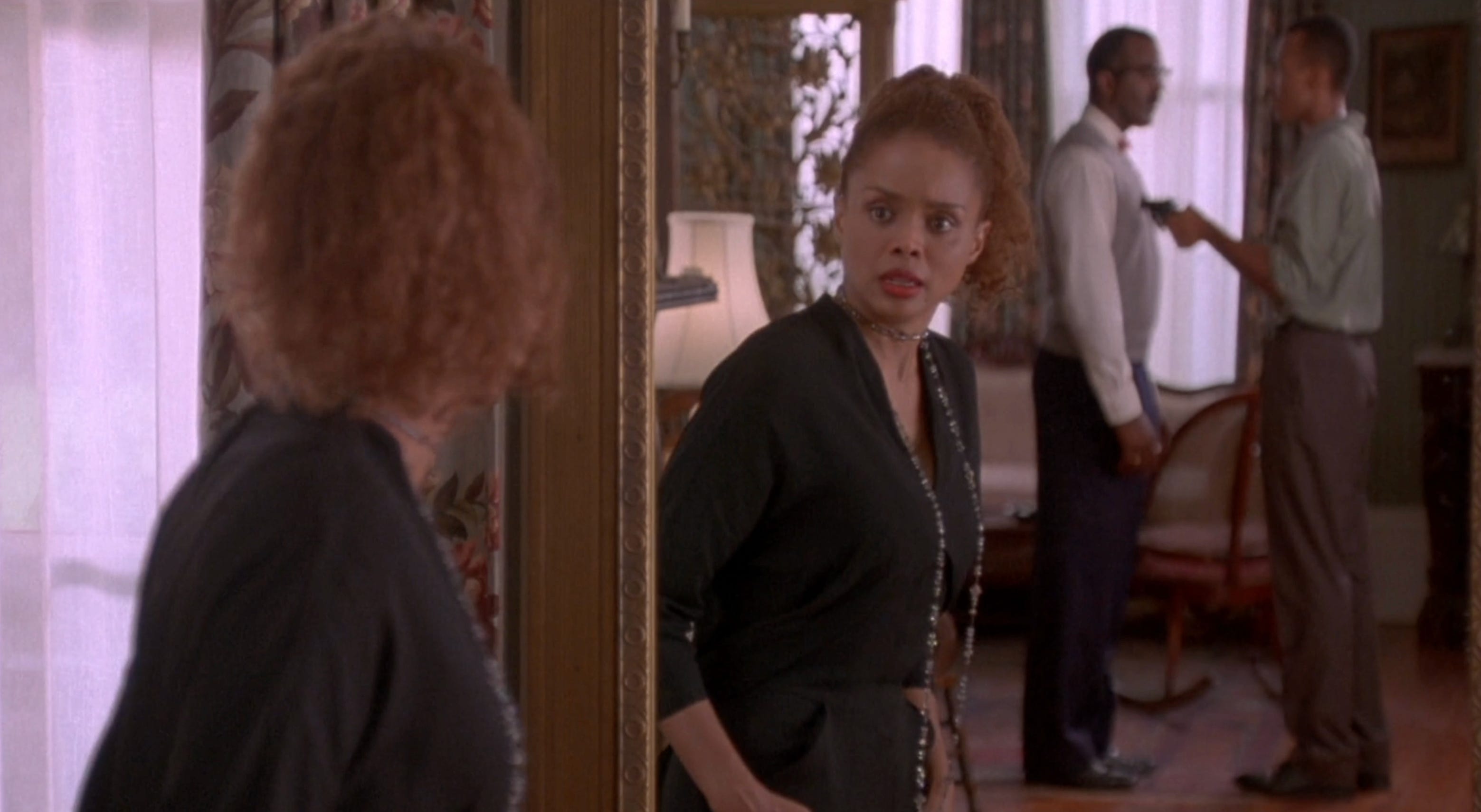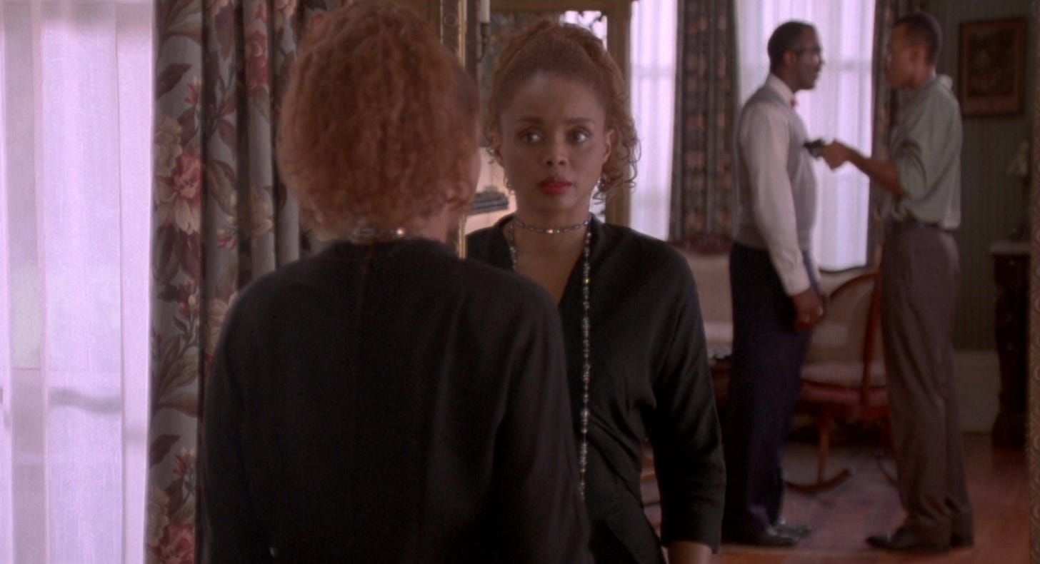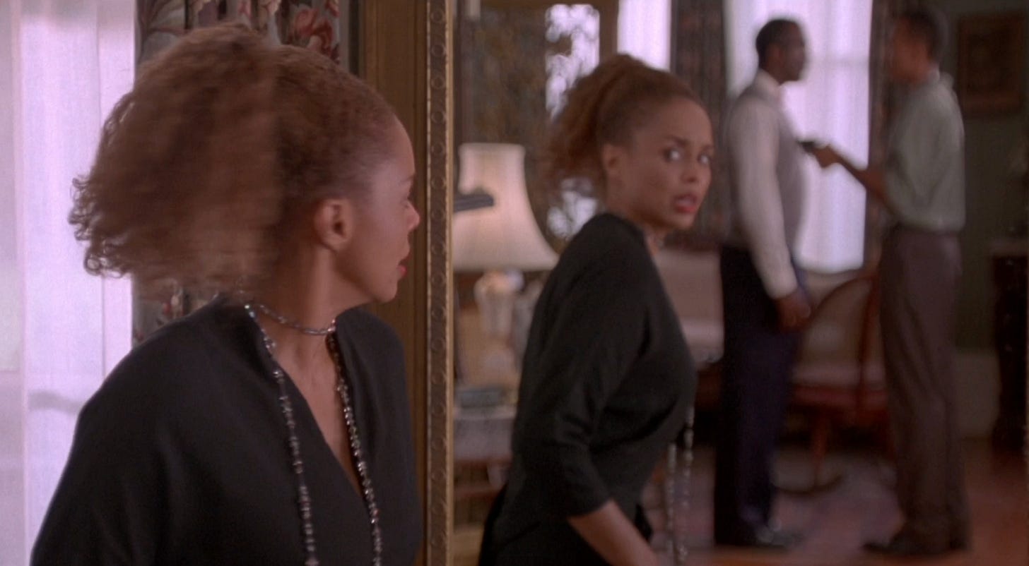 So many kudos to Debbi Morgan for this performance, which would have required a very specific pace in her walk, likely avoiding equipment and wires and electrics etc. on her way from one frame to the next, getting her eyelines right when she looks back at Eve (which probably means looking at a bright piece of tape), and doing all while a camera and crew members are also moving around.