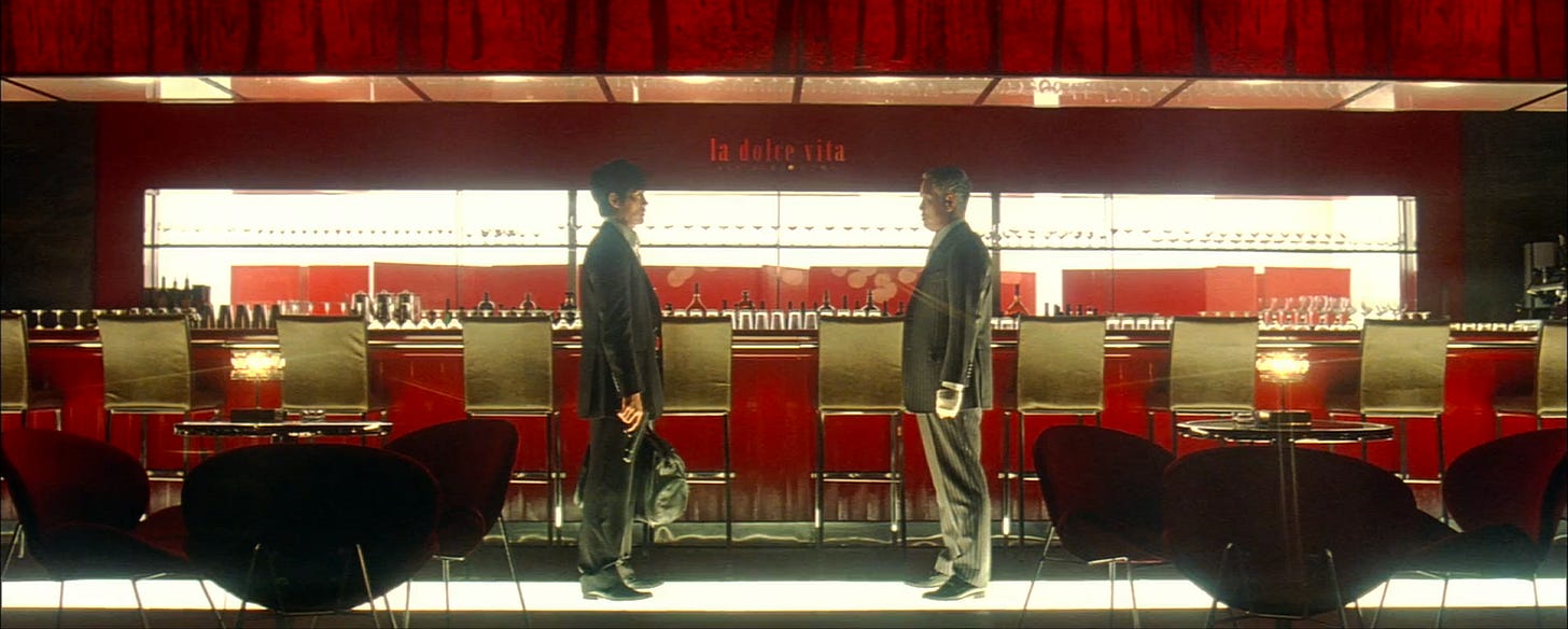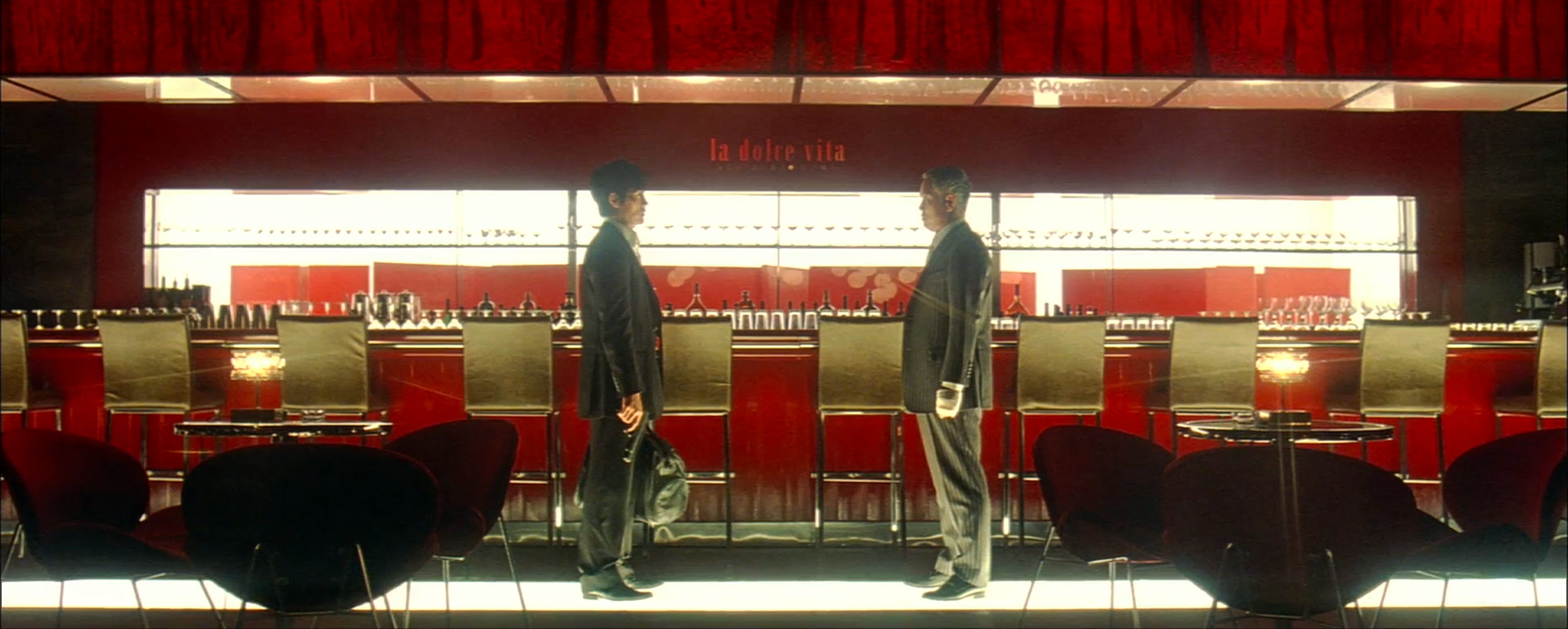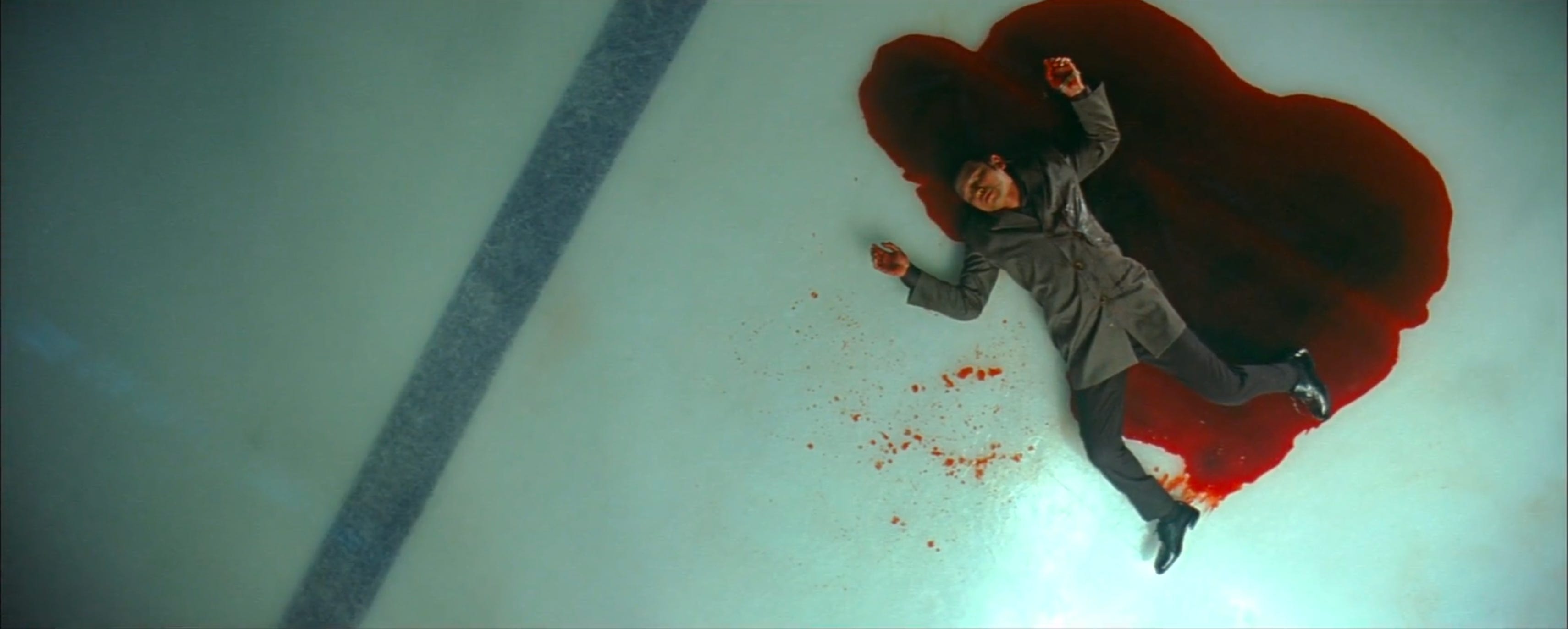 Red makes several appearances as both main and accent color in the film, including in its notable bookending coffee scenes which lend extra meaning to its title, a beautifully symmetrical shot (#1, below) and a stark pop against a large flat sheet of hockey rink ice (#2, below).