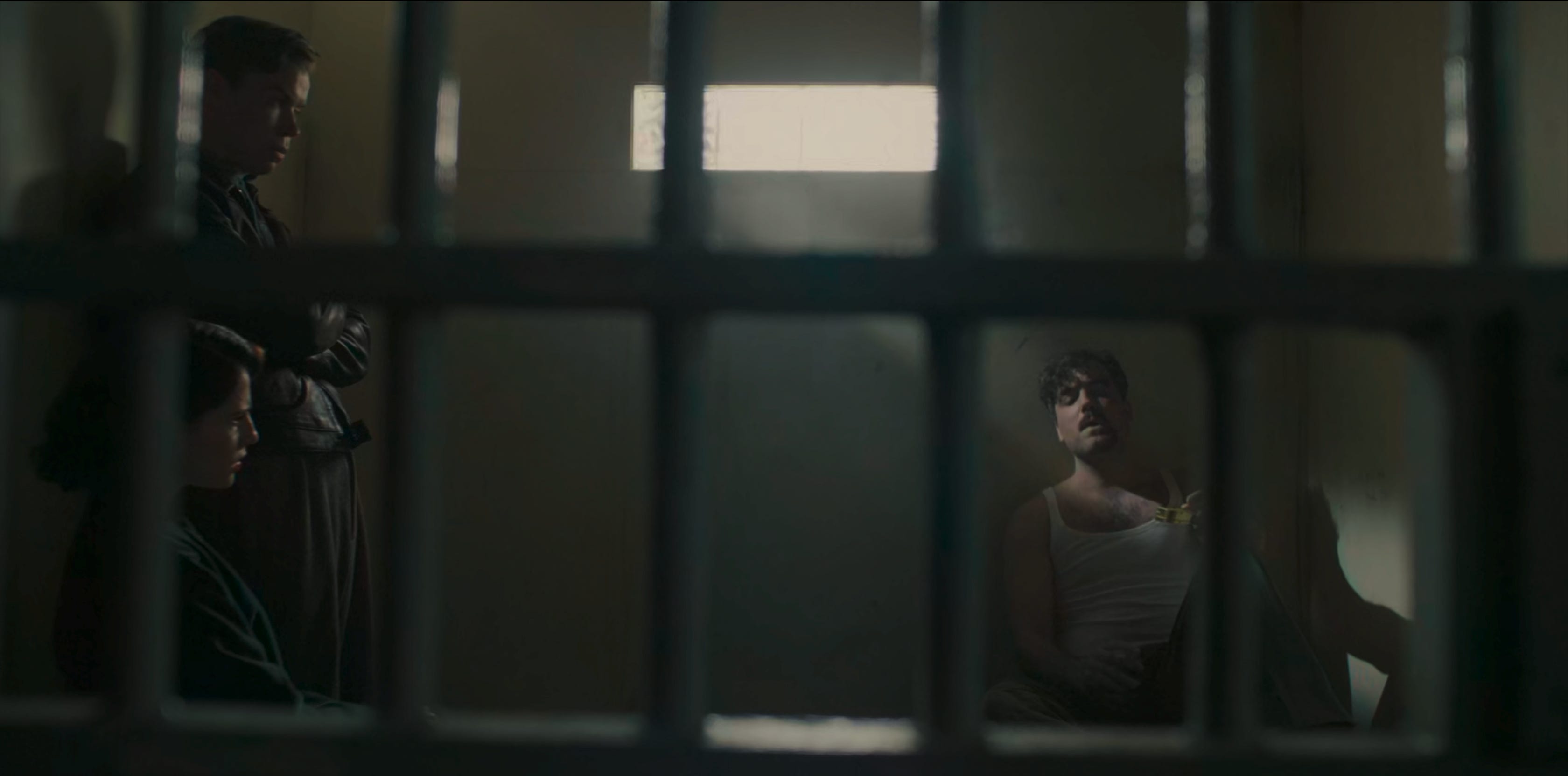 What better way to accomplish three things at once — a little ‘frames within frames,’ shallow depth of field in the foreground, and distinctly separating your morally opposed characters — than using jail cell bars?