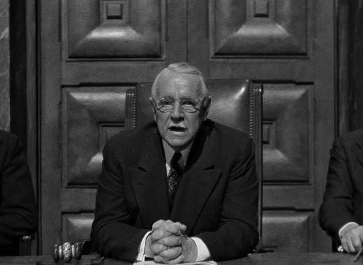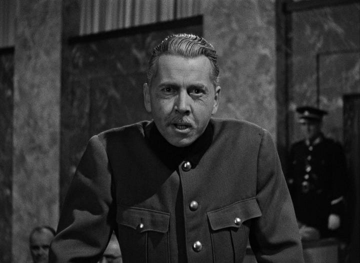 First, war criminal Wilhelm Grimm looks into the camera and says he waits for the people to ‘come to their senses’ and support the Nazi cause. Then the judge looks to the camera in a direct response and asks the audience to decide what they think should be done.