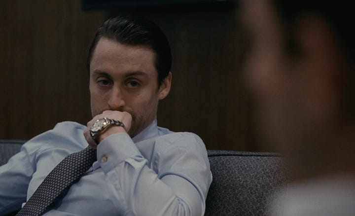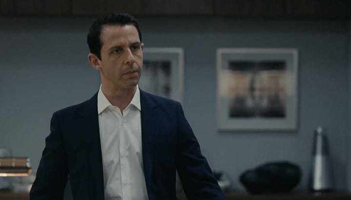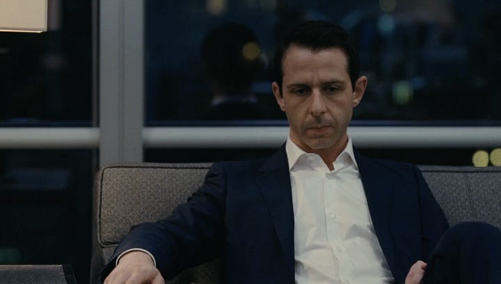 It’s relevant how Succession plays loose with its camera, its fly-on-the-wall-or-by-the-seat-of-your-pants style floating camera giving a slight documentary or reality show feel — this feel also means casual blocking and line crosses are more common and may be incidental. The way Roman and Kendall are juxtaposed in this scene, however, makes it feel quite intentional.