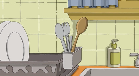 The way it’s framed makes the joke work, because *mom doesn’t know* she’s setting up (and then delivering her line next to), Hiro’s picture of The Beatles. If mom knew, it’d be too cute by half, but we can tell she doesn’t see the photo, even as she draws the camera and our attention to it.