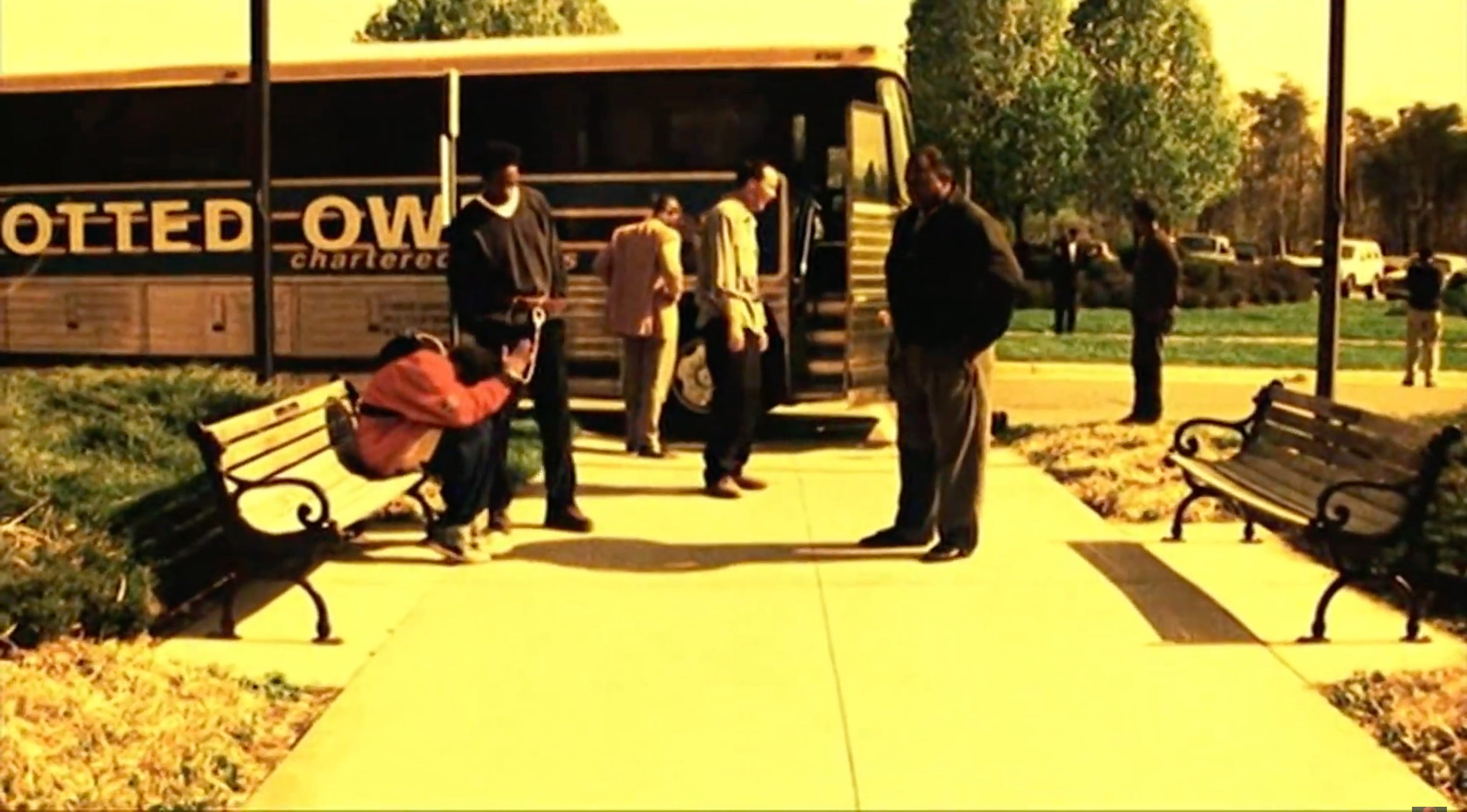 This shot from Spike Lee’s “Get on the Bus” shows several men who have spent the last many hours fighting, agreeing, and trying to see each others’ points of view, now having come nearly to their wits’ end.