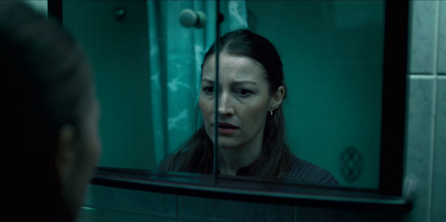 Sarah (Kelly Macdonald) is also torn about her feelings about a gangster, only she’s unsure whether she should help him or not. She stares at herself in her own bathroom, the dividing line of her medicine cabinet mirror showing her own internal division.