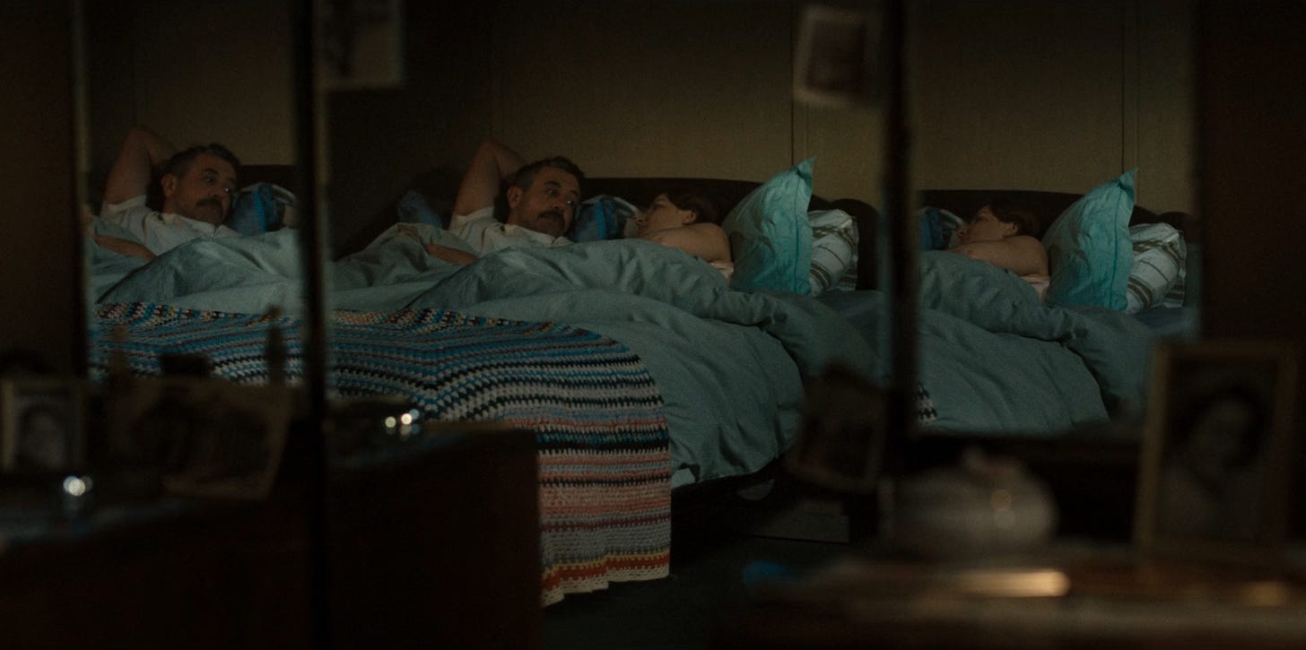 They go so far as to give Terry and Annie (Warren Brown and Faye Marsay) a three-way mirror in their room, the better to display when they are disagreeing and so feel apart even when they are together (top) or torn as to what to do next (bottom).