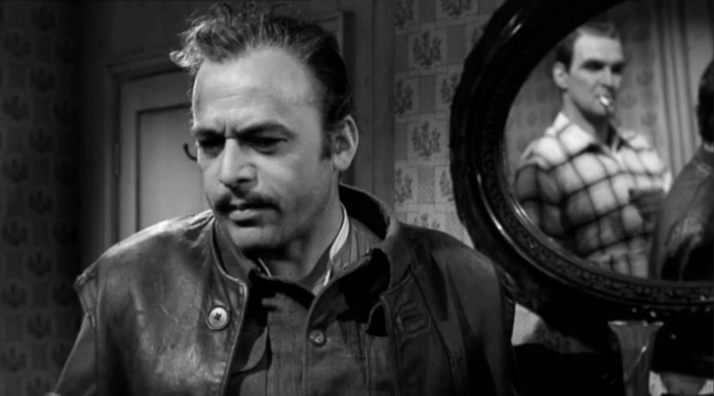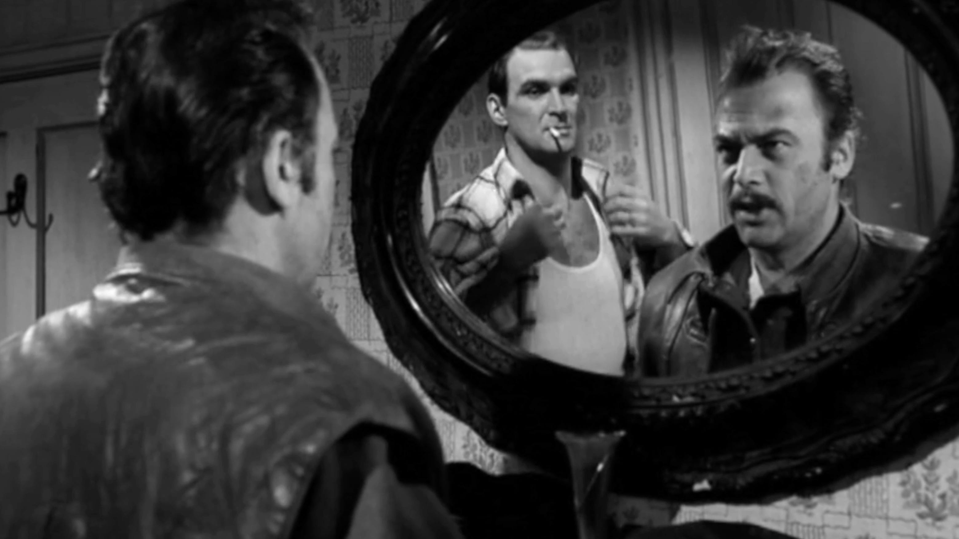 Like the aforementioned Blackout, this scene from Hell Drivers shifts camera and characters to use the mirror to show Tom and Gino (Stanley Baker and Herbert Lom) in different configurations as they try to figure out what they think of each other, and decide whether they will be enemies or friends.