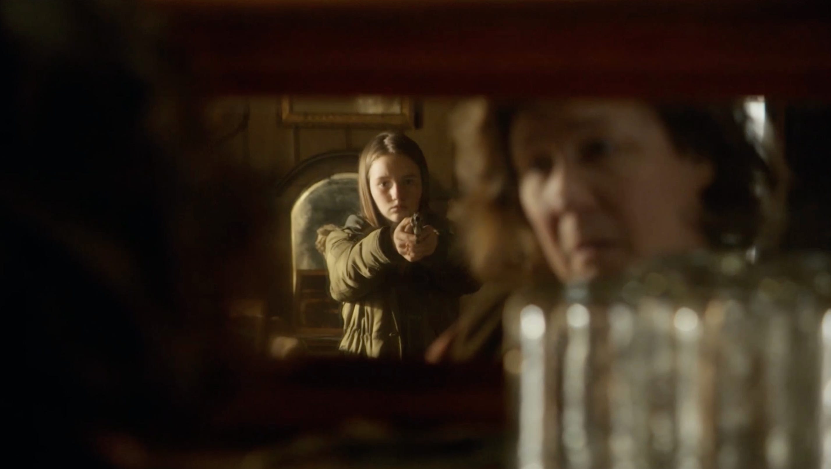The shots continue to use the mirror for a reveal of what Loretta pulling a gun, even as we are still ‘with’ Mags.