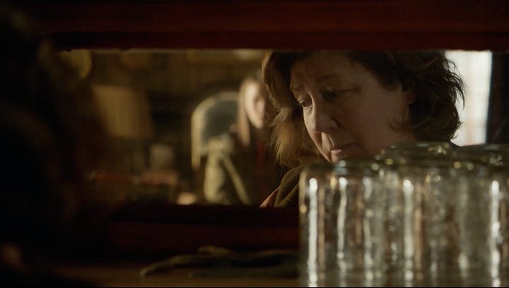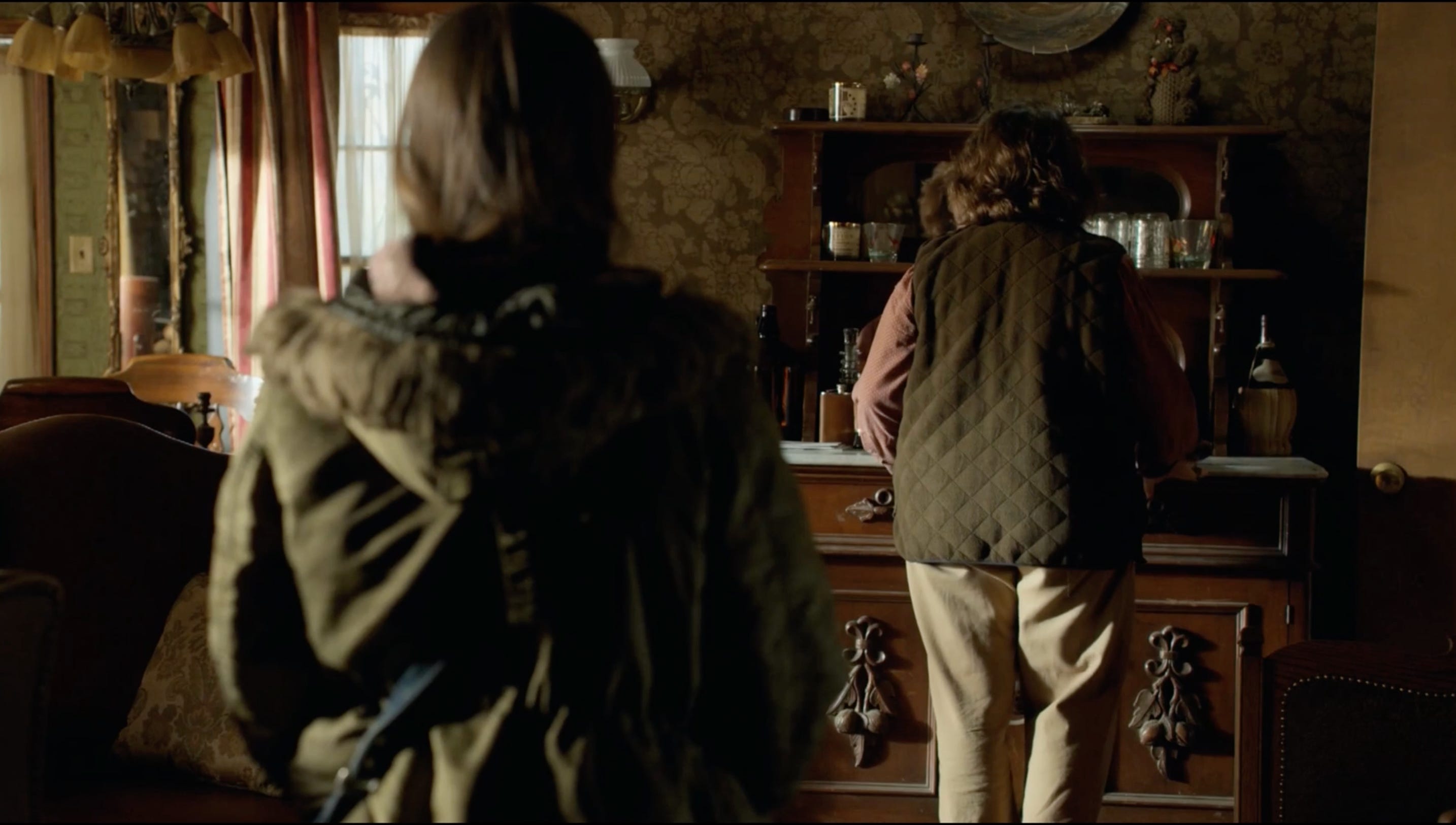 This short, tense exchange between Mags Bennet (Character Actress Margo Martindale) and Loretta McCready (Kaitlyn Dever) in Justified 2.13 “Bloody Harlan” uses the thin bar mirror a few different ways.