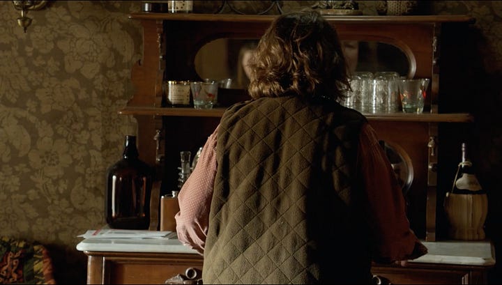 First the mirror is established in the context of the room (photo 1, below); then the mirror is used to keep us aware of where Loretta stays as Mags pours a drink (photos 2 and 3); Mags has no problem keeping her back to Loretta most of the time, even as she pours [what she and we know to be] a poisoned glass.