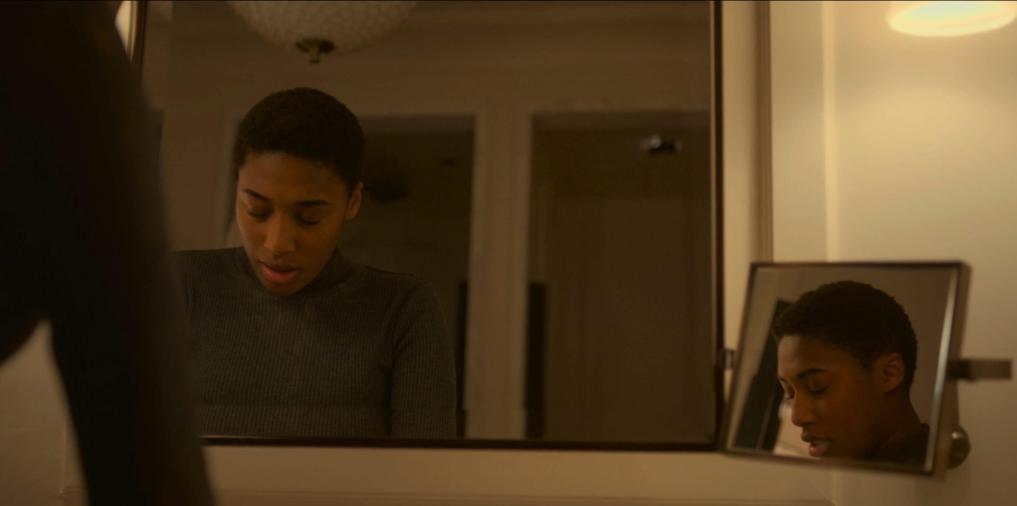 Finally, a little later also in Sarah’s bathroom, we see Rodney (Will Sharpe); a character who has made up his mind even though he is not thrilled about it. This scene changes it up a bit; he’s not divided, he’s made up his mind, he just is a bit scared, and the shot racks from one face to the other, even as he avoids looking at himself.
