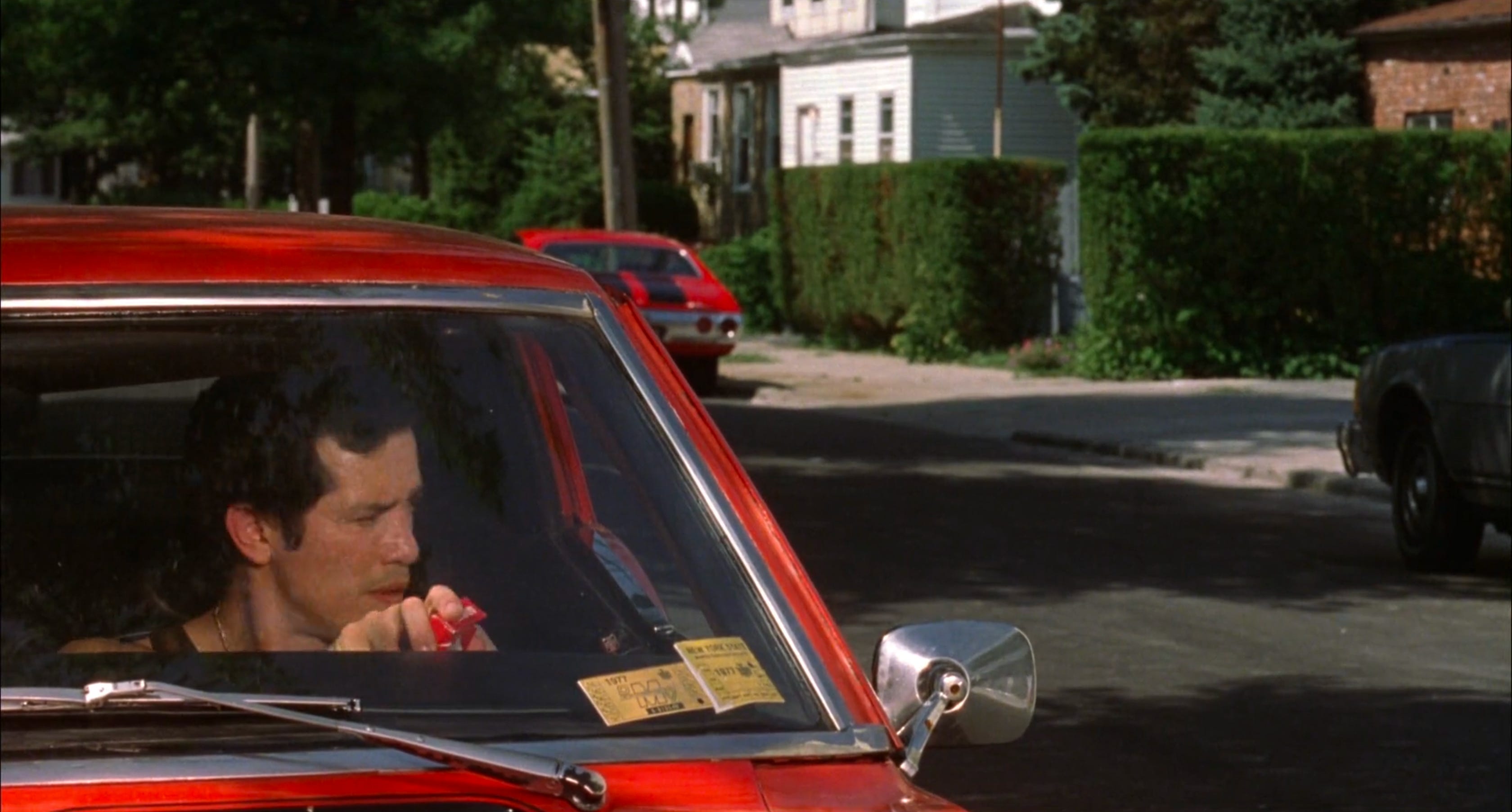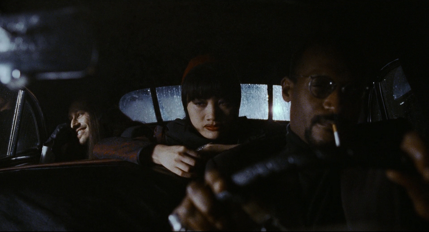 This shot stages all three characters along different planes: far back left talking on the phone, middle centre lost in thought, and front right smoking and driving.