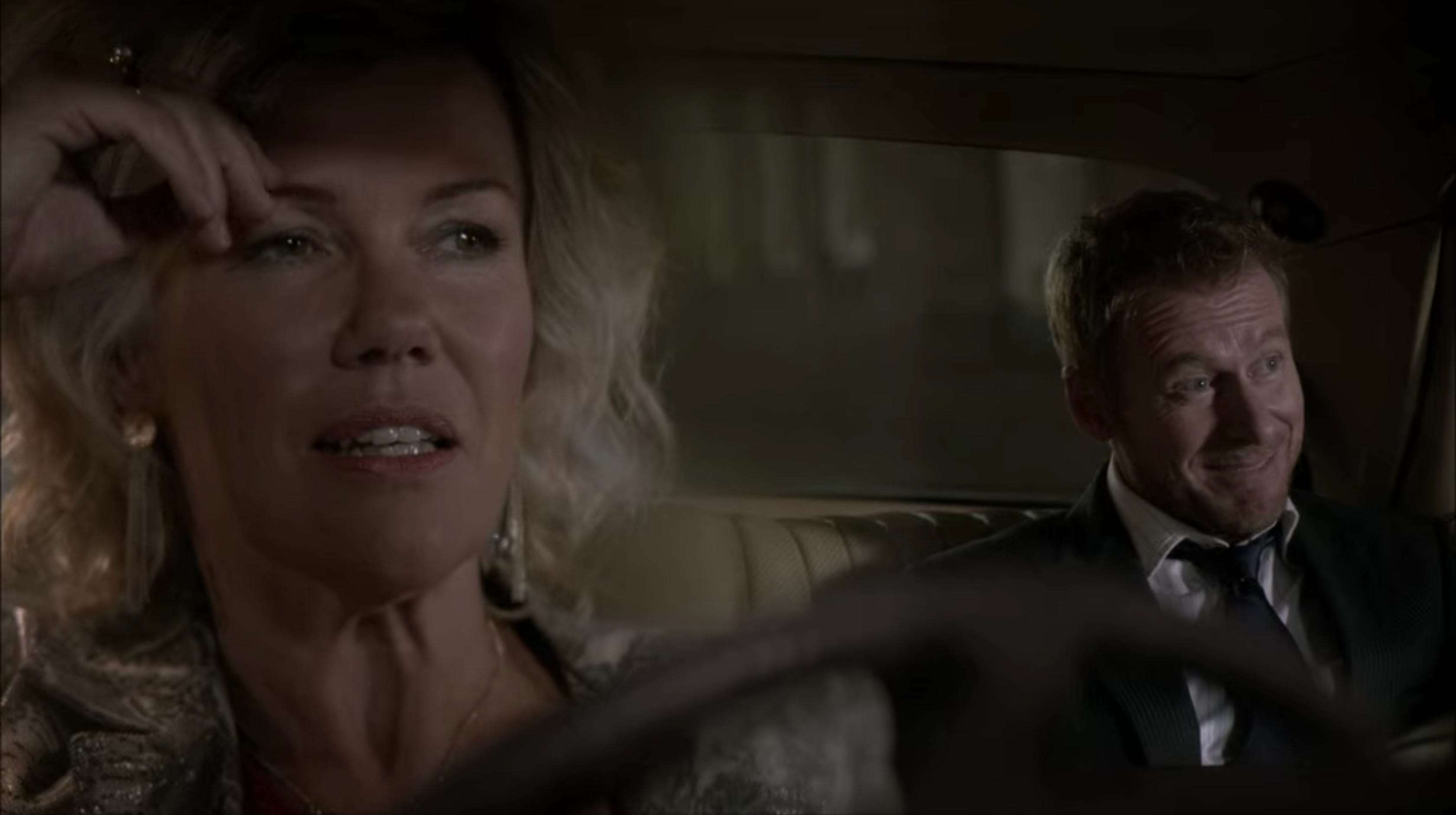 Kirsty (Robyn Malcolm) sits up front and Cleaver (Richard Roxburgh) sits in the back, both in focus.