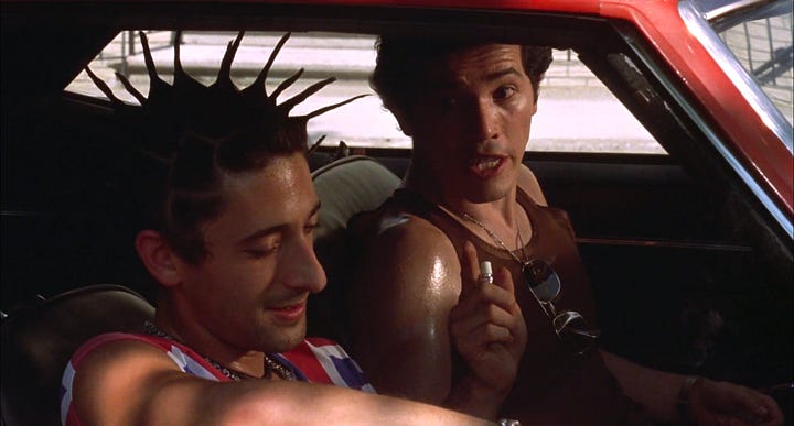 As Ritchie (Adrien Brody) and Vinny (John Leguizamo) chat, Spike highlights their disconnect by showing them mostly in seperate frames, but also by placing them in different places in their solo frames to where we would expect them to be — eg. from this wider establishing shot we’d expect to see Ritchie on the left, Vinnie on the right: