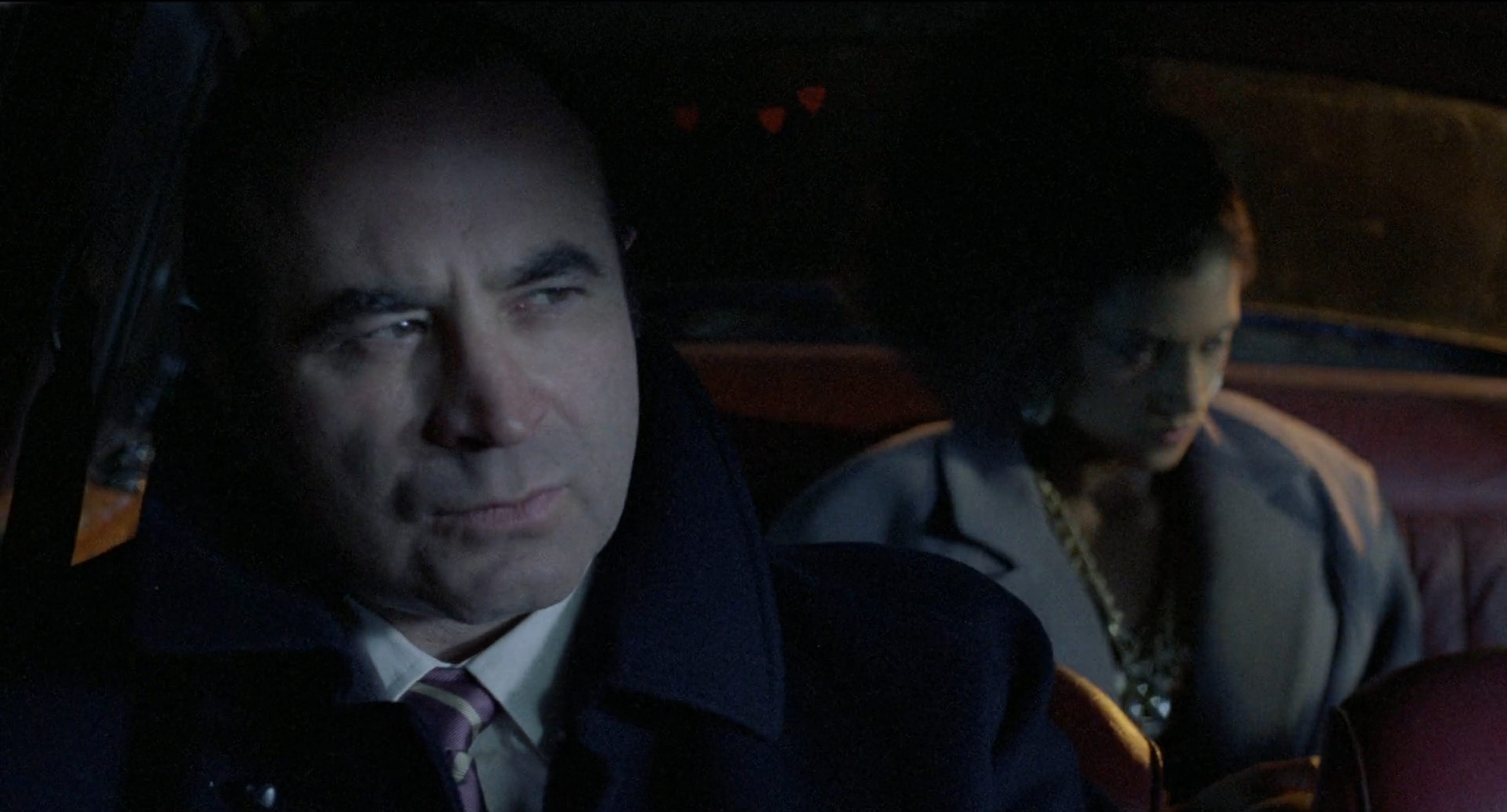 The medium two-shot shows cooler white light on George and more red seat leather around Simone. But it's the singles which really bring it home: George's single is cool blue with his mouth more lit and his eyes mostly shadowed. Using the rearview mirror to frame Simone lets the in-focus section show mostly red, and highlight her eyes.