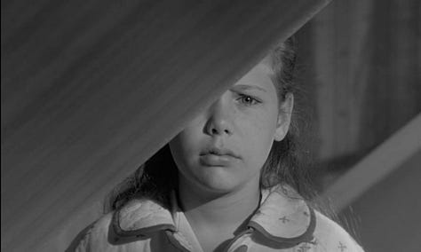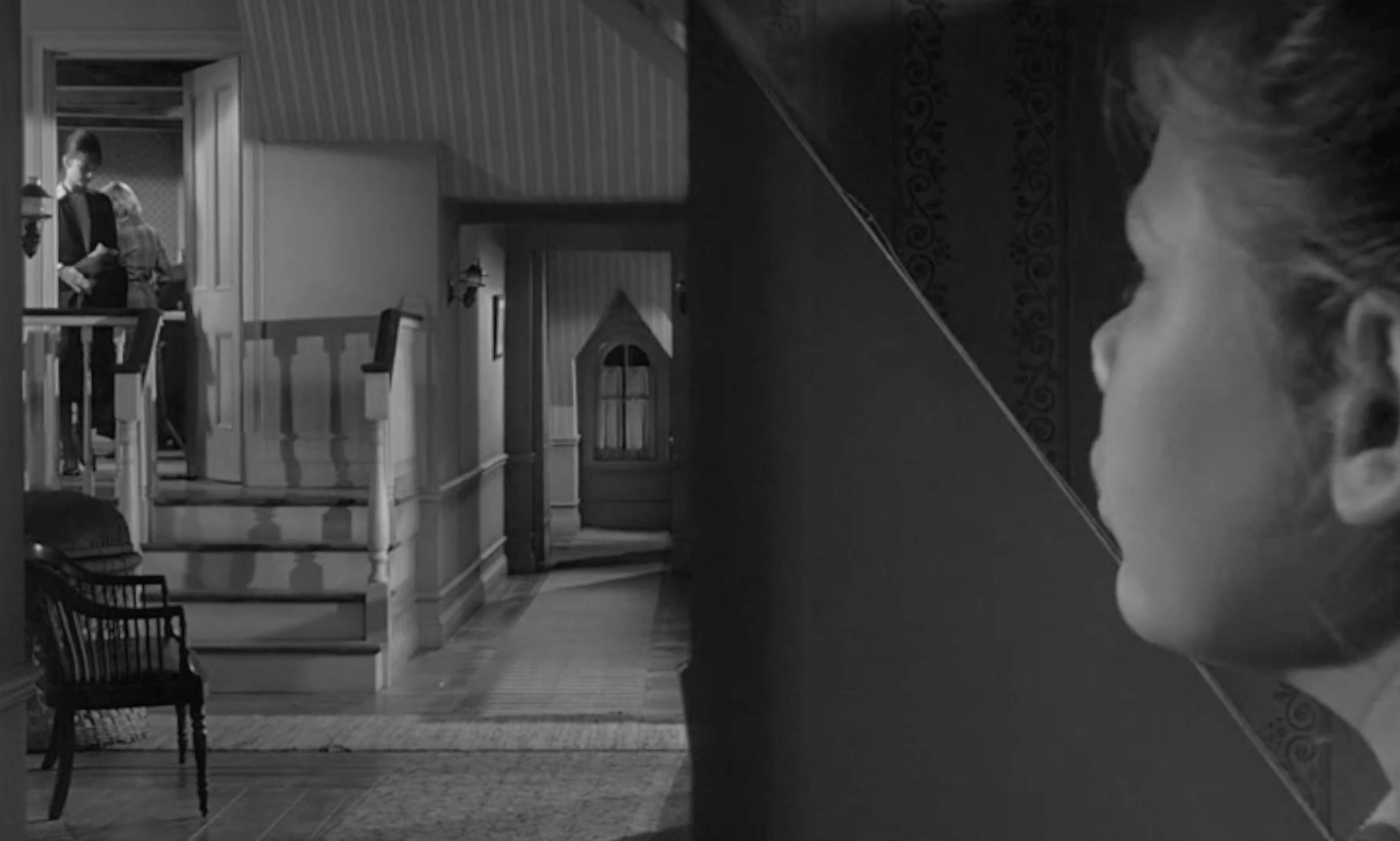 The first split diopter shot is within a scene which has established Mary (child actor Karen Balkin) is spying on Karen and Martha (Shirley MacLaine) from the hallway.